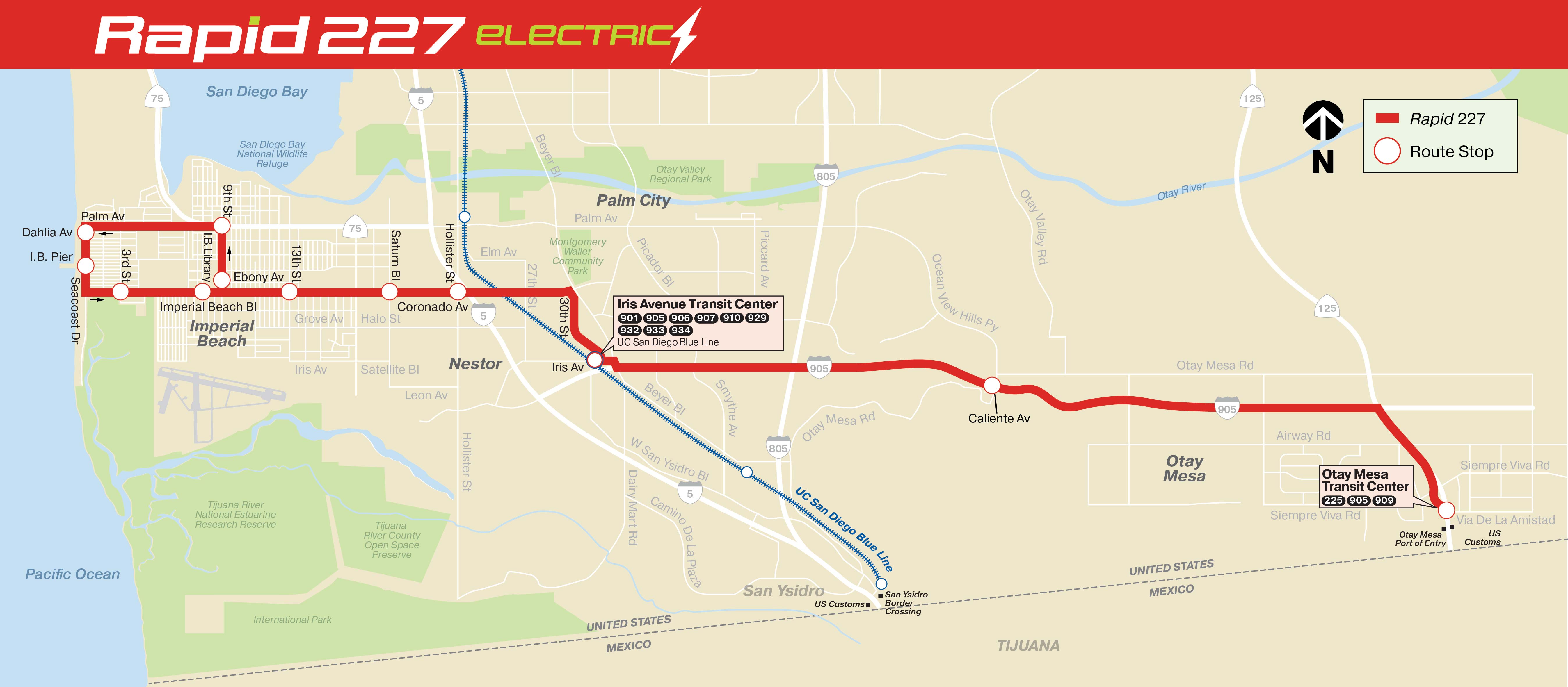 Rapid 227 is an electric Rapid route that connects Otay Mesa, Nestor, and Imperial Beach, with service to the UC San Diego Blue Line Trolley at the Iris Avenue Transit Center. With the expansion of pedestrian lanes at the Otay Mesa Port of Entry in 2024, cross-border commuters have a new quick and convenient option for access to coastal destinations, regional employment and activity centers in South County, downtown and central San Diego.