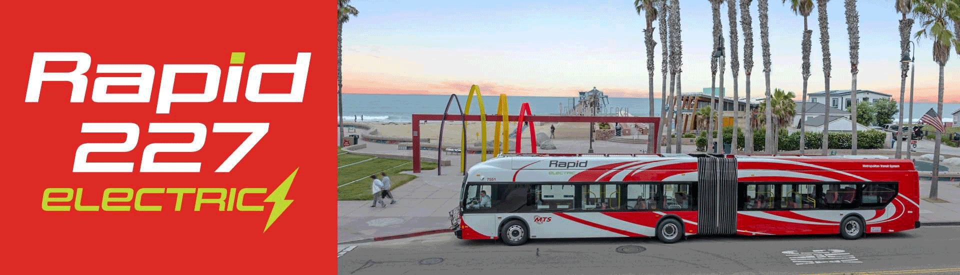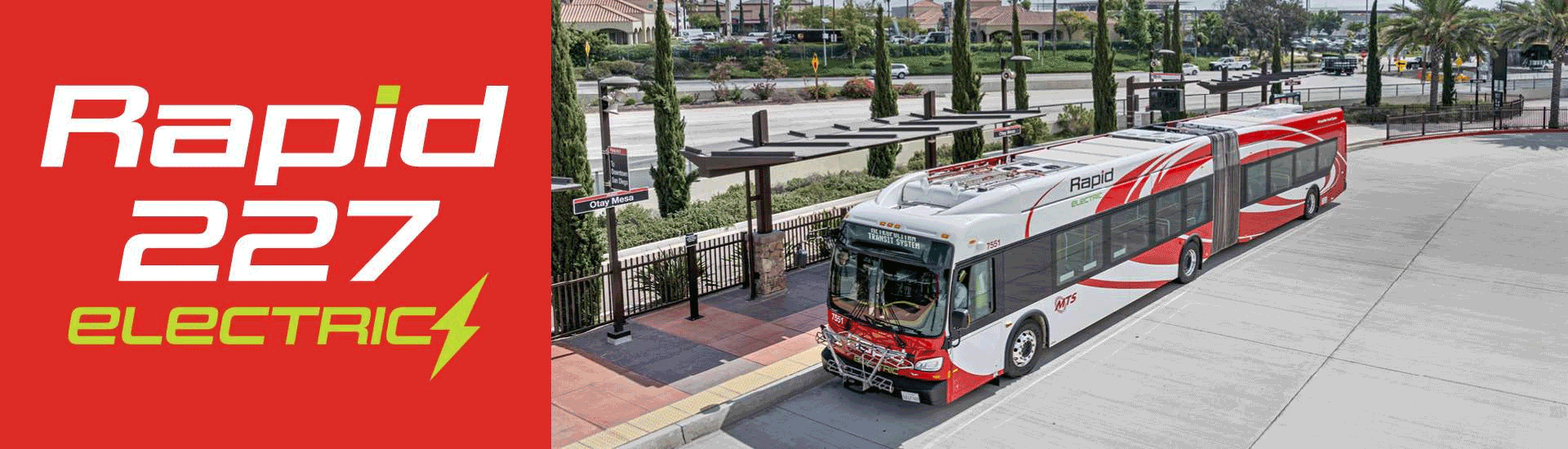 Rapid 227 is powered by an electric bus fleet – the first of its kind in San Diego. These state-of-the-art vehicles built by New Flyer offer comfortable rides, large windows, high-back seats and fast service. They are quieter than gas-powered buses, and produce zero tailpipe emissions, which results in cleaner air for the communities Rapid 227 serves.