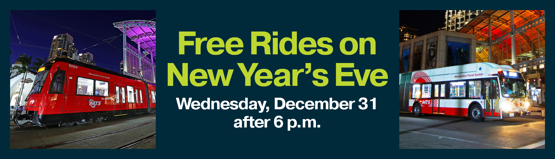 Free rides sponsored by BriceHouse Inc. will be on all MTS Bus and Trolley routes after 6 p.m. until the end of service on New Year's Eve! Passengers will not need a fare when boarding MTS after 6 p.m.